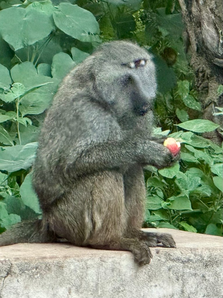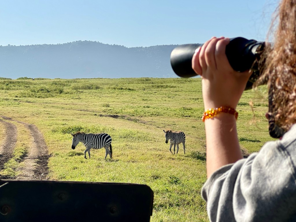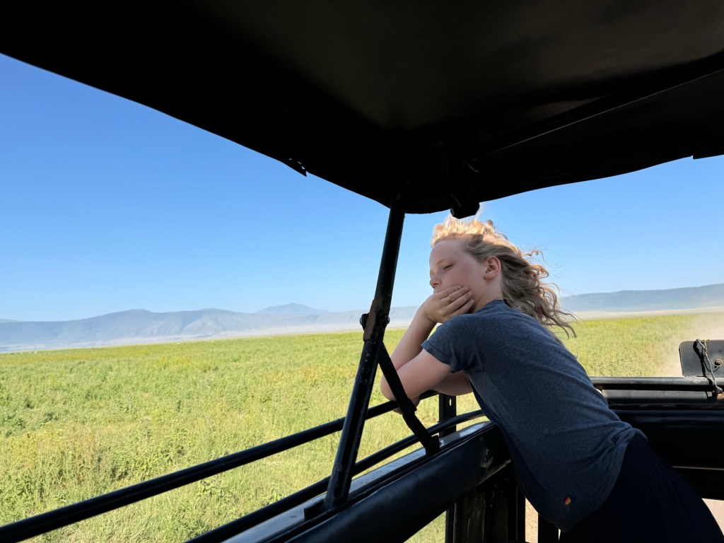 First we drove to Ngorongoro Crater — the world’s largest inactive, intact, and unfilled volcanic caldera.  When we arrived at the entrance gate, our driver and guide, Julius, told us to close our windows because the baboons would jump in and grab our food. One family member scoffed at the likelihood of such an event and kept their window open. Before we knew it, baboons were surrounding the car and one had jumped in and began rummaging through the car. Everyone at the gate quickly jumped to our aid and cleared the area, and the baboon happily jumped out of the jeep eating our apple after having a few other snacks. Lesson learned:  listen to our guide!