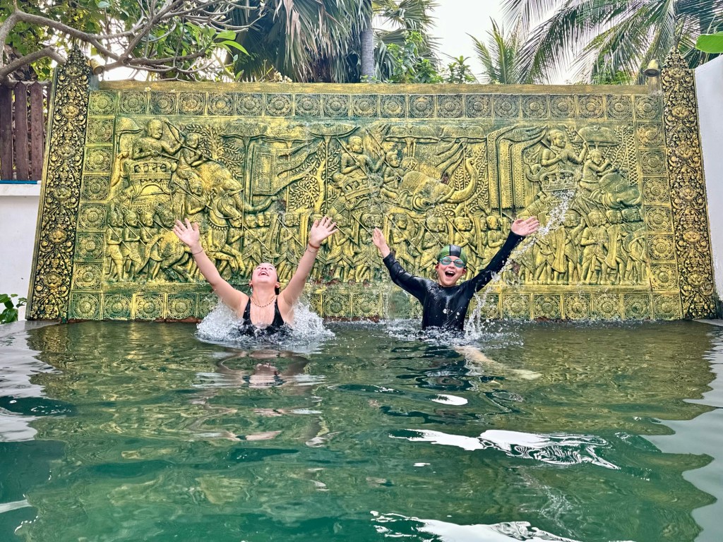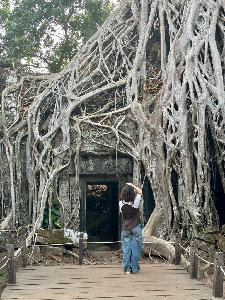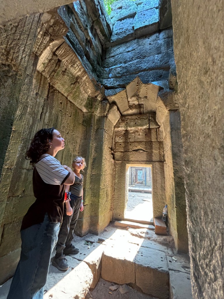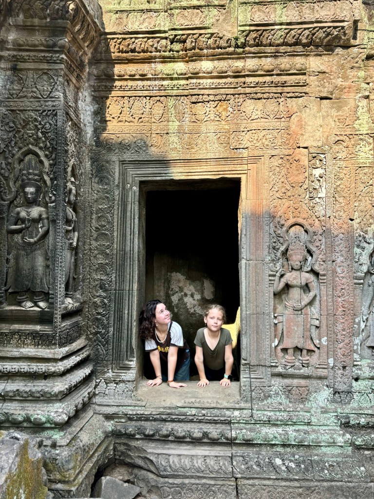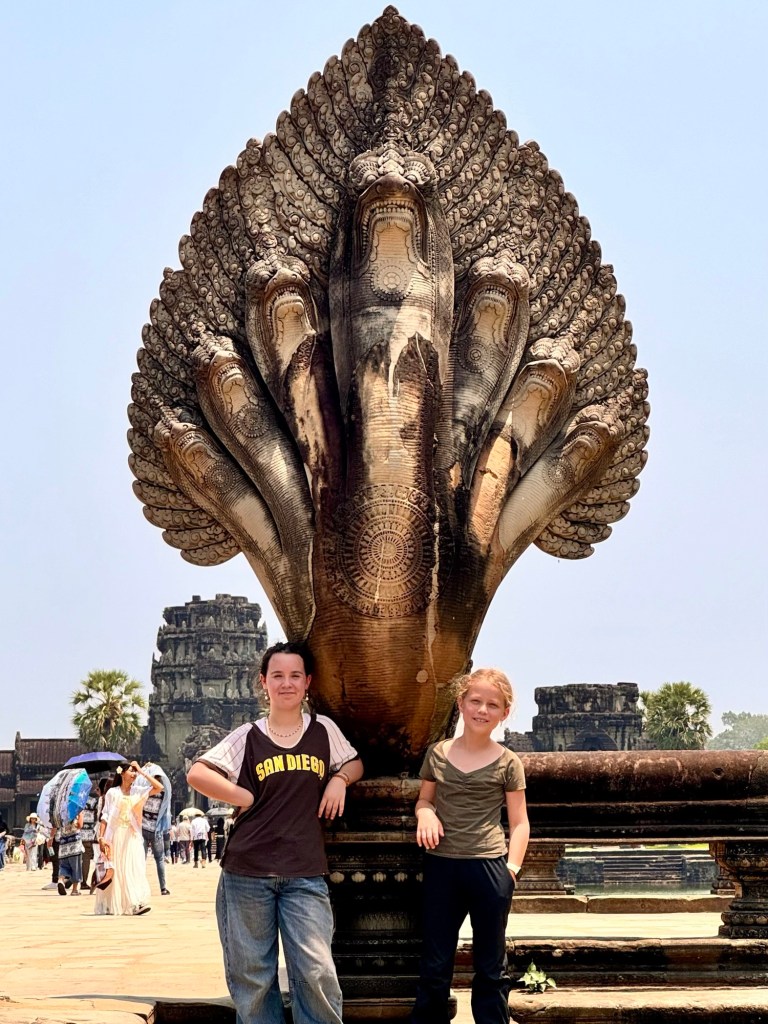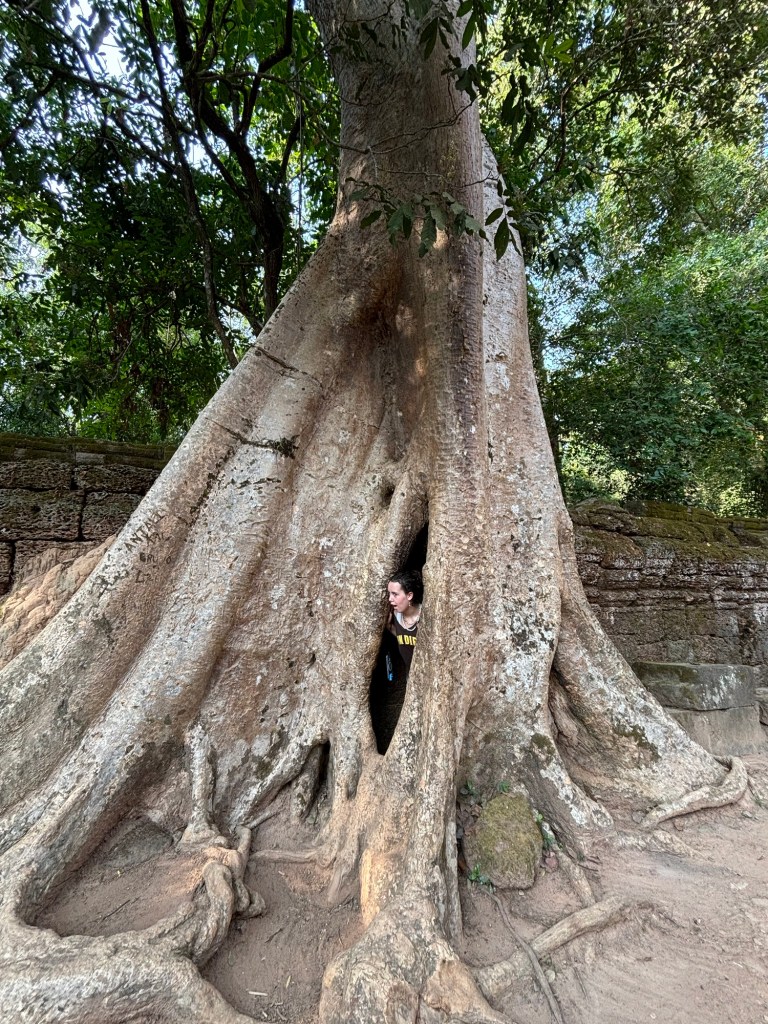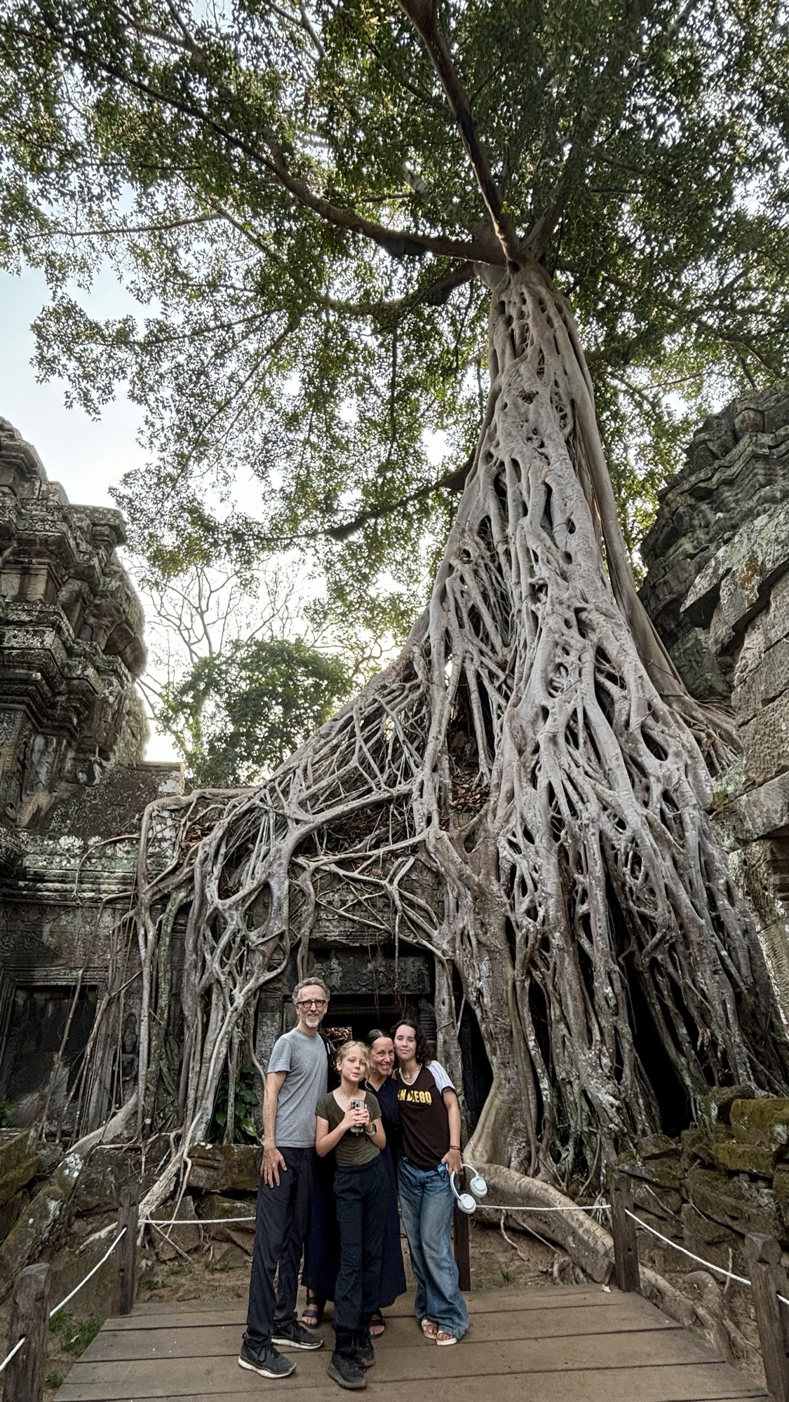 Seeing Angkor Wat was on my (Johanna’s) bucket list so that was a priority.  Dennis and I obsessed and watched all kinds of videos about avoiding the peak crowds.  In the end we decided to do the shortest tourist circuit because that was the most realistic for our kids.  Then, on the way to the temples at 5am, the guide advised us that it was the spring equinox and around 20,000 visitors were also expected to be there for the sunrise.  Oops, we missed that part in our planning.  We decided to watch the sunrise from a nearby temple and wait for the crowds to clear out.  Then we went immediately to Ta Prohm, the temple famous for being overtaken by tree roots—and being featured in the movie Tomb Raider—to experience it without the crowds.  We did everything in reverse and finished at Angkor Wat which worked out perfectly for us.  It all lived up to the hype.  We were also really happy that we were able to walk around Ta Prohm in the quiet with birds instead of crowds and the kids loved finding ancient chambers where you could pound your chest and it would echo.
