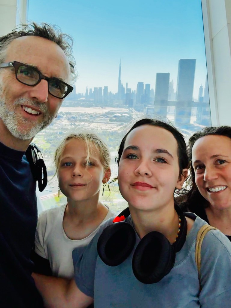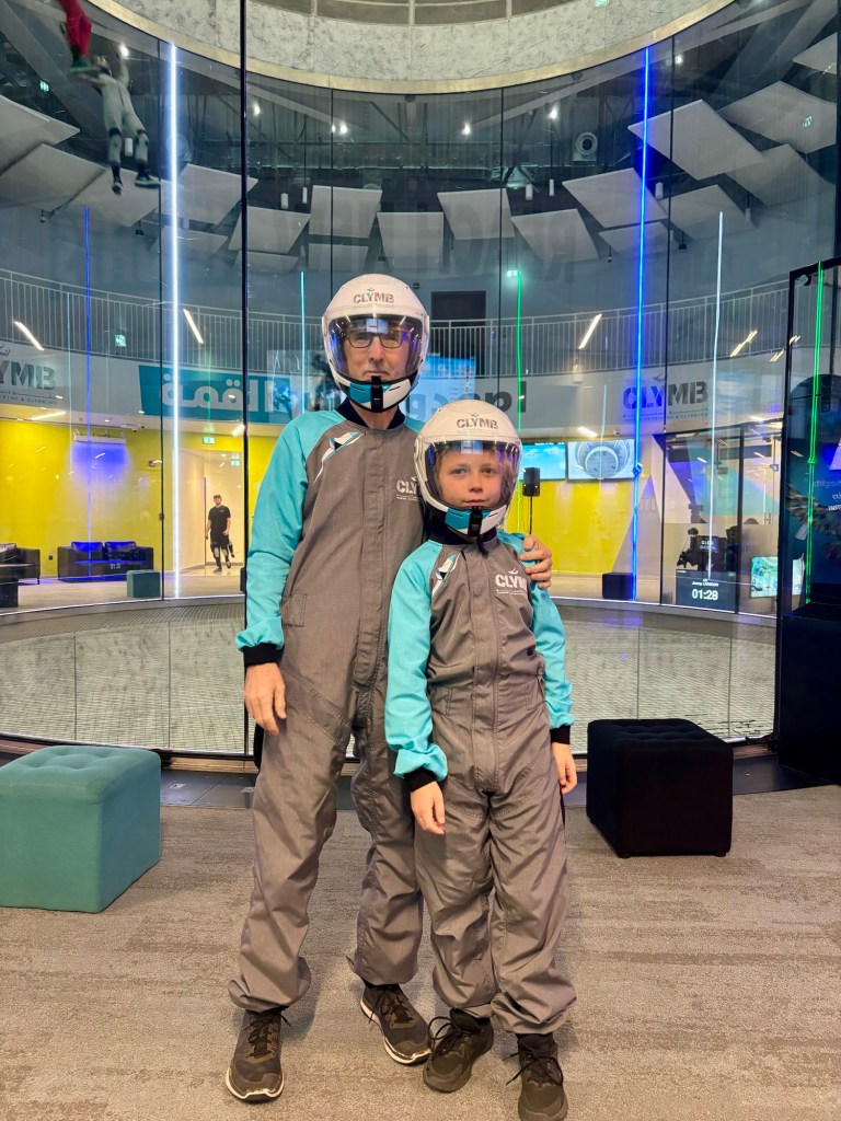 Dennis and Dev stayed in the UAE. Dev had a “choose your own adventure” week where they did all kinds of fun things that Dev got to pick out. Between Dubai and Abu Dhabi, they went indoor skydiving twice including at the world’s largest skydiving wind tunnel; went to the top of Burj Khalifa; went on many roller coasters including the world’s fastest one at Ferrari Land (149 mph in about 4 seconds); visited the Museum of the Future (that building is amazing); and went to the largest water park in the world. They also went to multiple virtual reality experiences, watched movies, climbed walls, jumped on trampolines, and had lots of screen time.