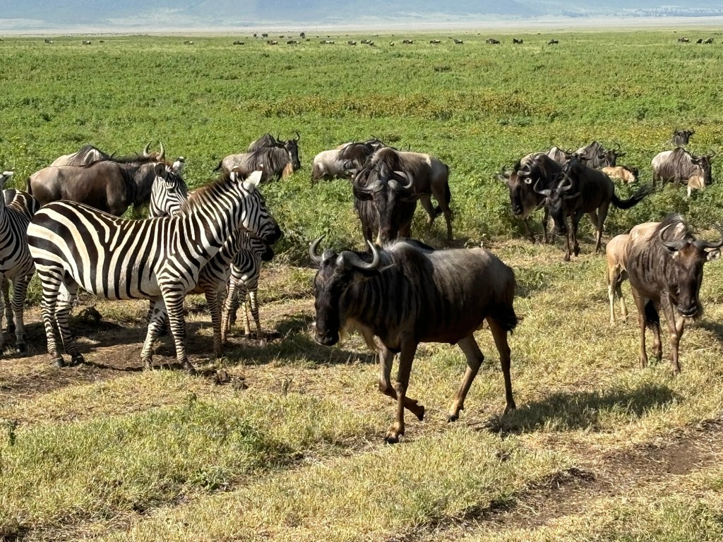 With that, we popped the top of the safari jeep, stood on our seats, and drove down into the crater. It was just after sunrise, there were no other cars in sight, and even the smell was amazing. The scenery alone was, as the kids would say, “Majestic!”  There were so, so many animals. We were soon surrounded by herds of wildebeest, buffalo, zebras, gazelles, and so much more. It was a particularly fun time because we arrived right after calving season so we saw lots of babies and kept saying things like, “baby warthogs have the cutest butt!”