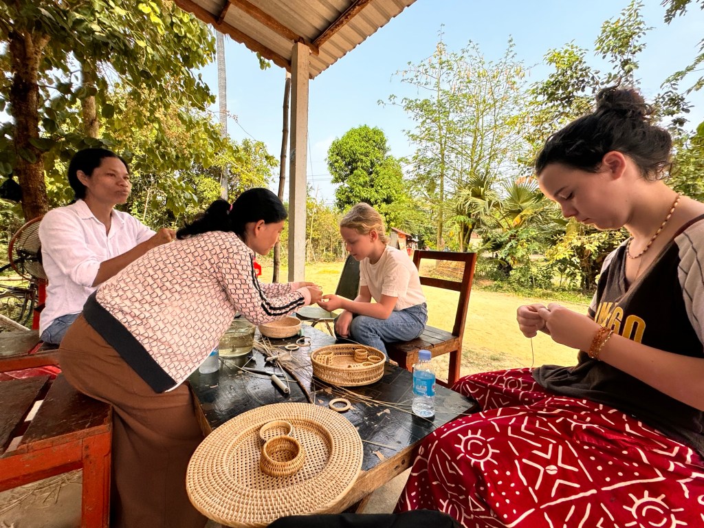 And then there were the craftworkers!  At Artisans Angkor, we took a tour of their workshop and learned about the skill required to create the traditional Cambodian crafts, along with the work being done to revitalize those same industries. On our last day we took a deeper dive; the kids took a traditional rattan weaving class in a nearby basketry village with some women who had a great sense of humor but also very demanding expectations for quality control.  Still, everyone agreed it was a super relaxing activity and the kids got to take home their own keychains.