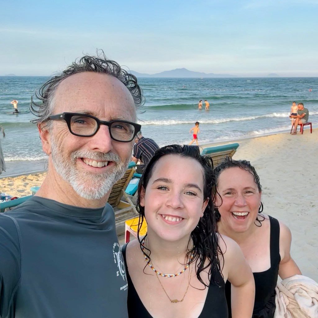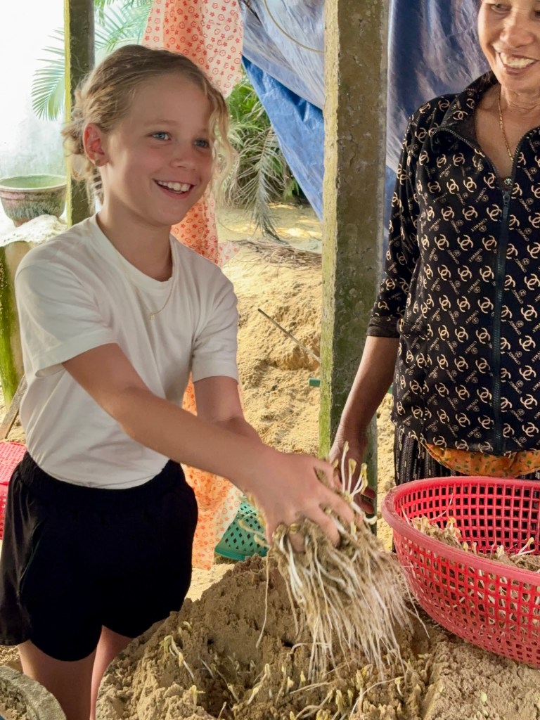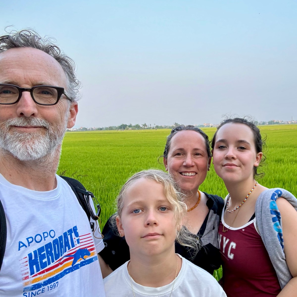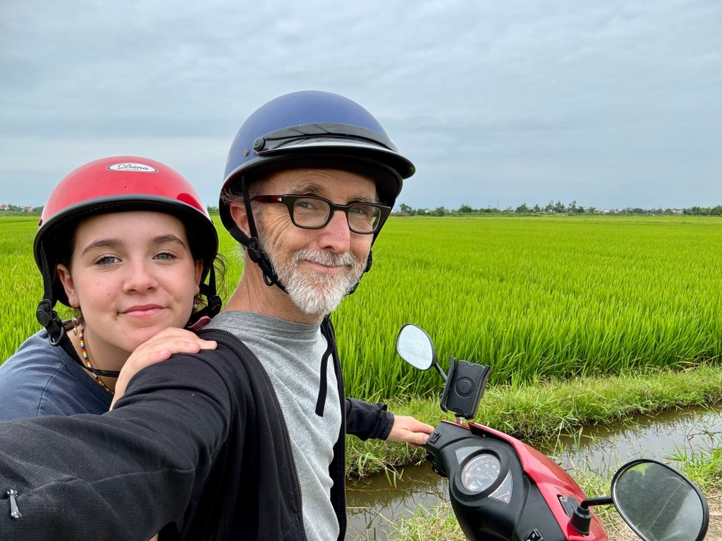We are spending a month in Hoi An, Vietnam.  The Hoi An Ancient Town is a designated UNESCO site but we are staying in An Bang Beach, a few minutes away, and the area is separated by beautiful rice fields (another check mark for Dennis who said he wanted to see rice fields).  We splurged to get our fanciest Airbnb and the owner has a daughter who is Mira’s age and they have been able to hang out together, which has been particularly nice.