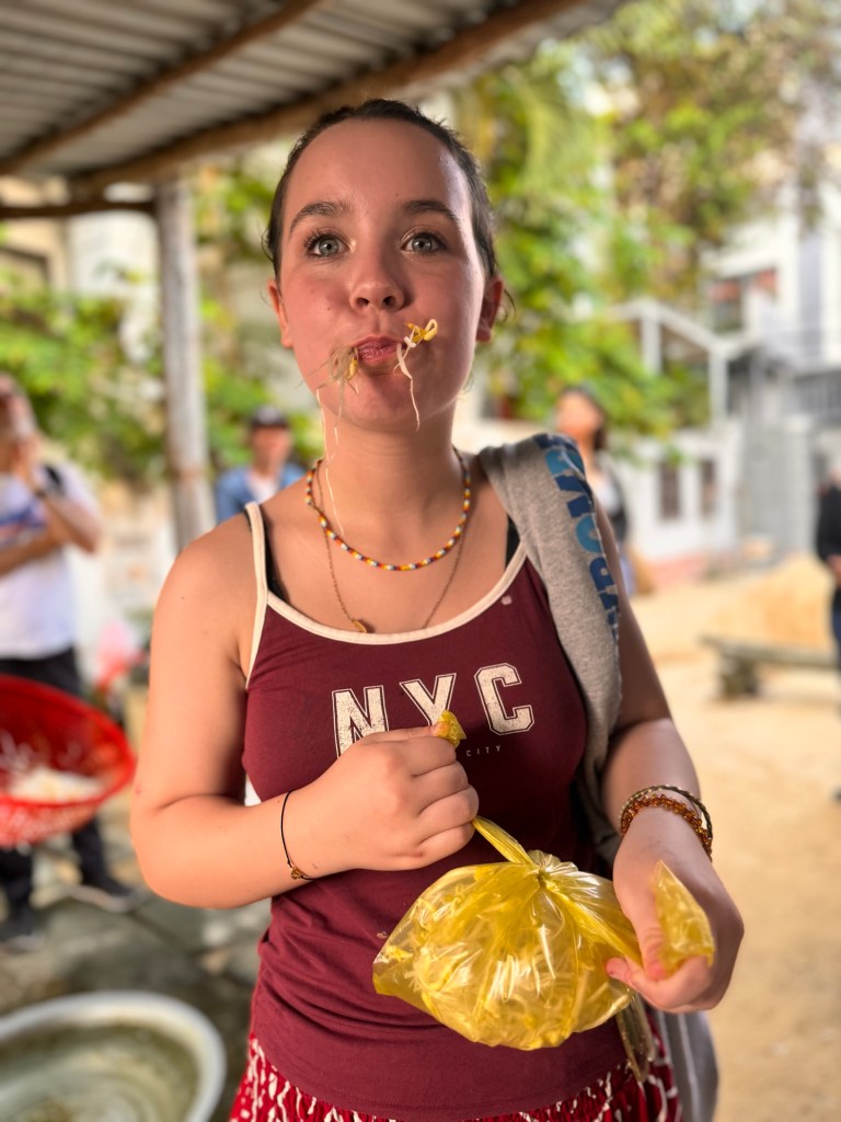Don’t worry, we also did another food tour.  This may have been one of the best yet, both because of the guide and the food.  We started by visiting a couple “factories” which are really homes where families make a certain food.  Both had been maintained for generations.  One family was cultivating beansprouts — which you can see Mira particularly loved — and another was making the noodles used in cau lau, a regional noodle and broth dish that is so, so good.  We even went to a restaurant that uses that family’s noodles.  In Vietnam, is it common that businesses, even restaurants, are run out of people’s homes and for us it is not always immediately apparent that it’s a business.  That was especially true for one bakery that had no signage at all and the tour group basically walked into their house to try the sweets.  When Dennis and I returned a few days later, I think they were pretty shocked to see us there.