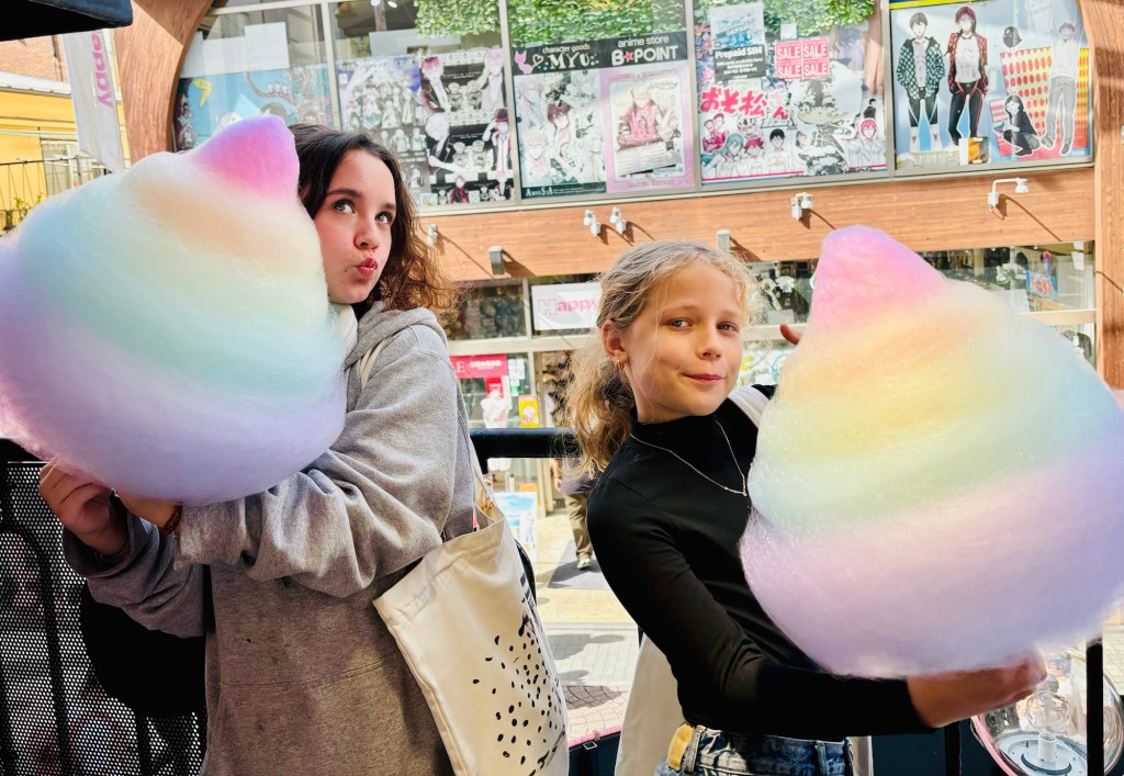 Our final week in Tokyo was super fun and kid-friendly. We especially maxed it out on Takeshita Street. We went to a mini-pig cafe and a second animal cafe where we got to play with ferrets, hedgehogs, meerkats, a fox, and a capybara. Life goals!  We also ate the most amazing — and huge — rainbow cotton candy.  We topped the day off with a visit to a cafe where they do custom 3D foam art on your latte or hot chocolate. Look for Hazel in the pics!